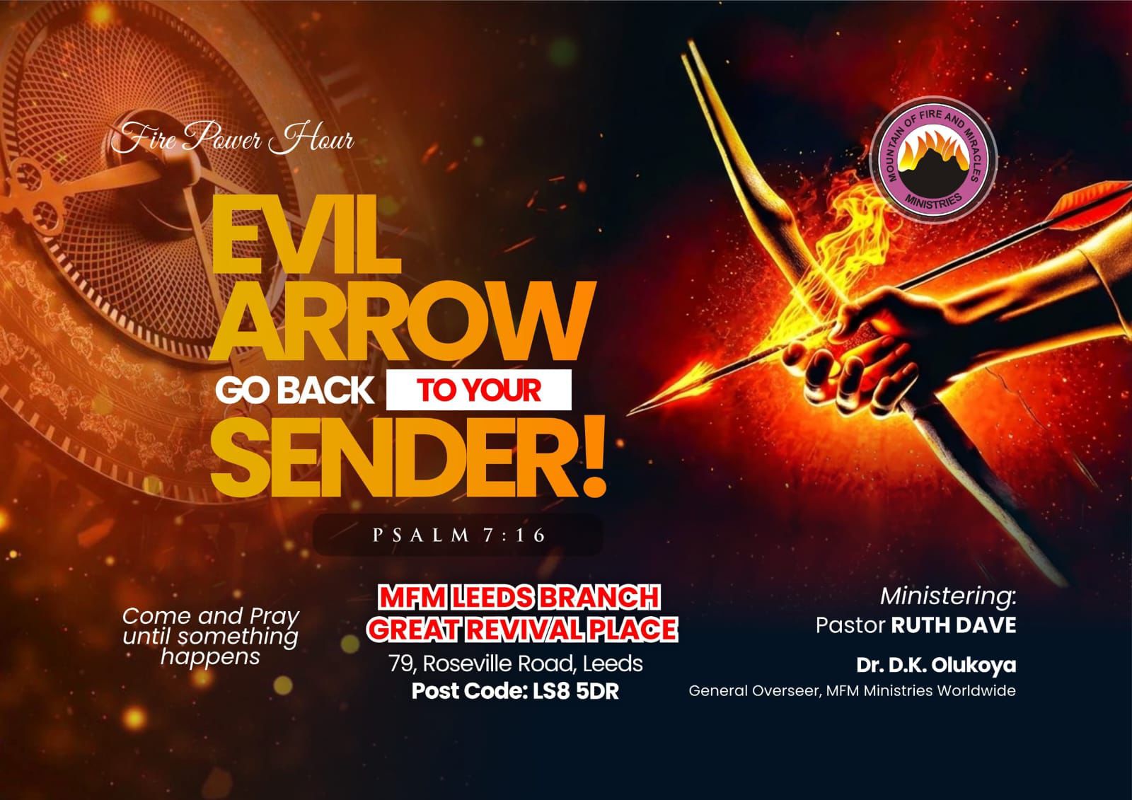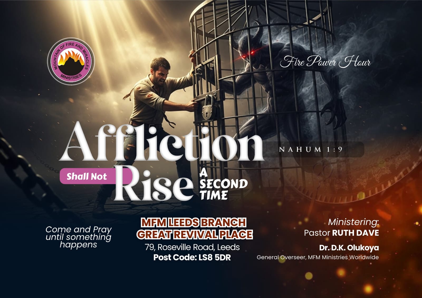 Fire Power Hour is a special in-house programme of MFM Leeds, held every Thursday, dedicated to igniting the fire of God in the lives of believers. It is a powerful time of intense prayer, deliverance, and spiritual empowerment, where members gather to confront every force of darkness through aggressive prayers and the Word of God, pulling down strongholds and enforcing victory through the power of the Holy Ghost.
